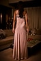 Featuring a dusty rose and taupe ombre gown in pure silk satin base with one-shoulder silhouette, beads and pearl embroidery. Accentuate it with zircon earrings, soft curls and block heels for cocktail soirees or evening celebrations.