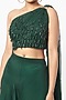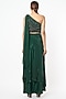 Featuring a midnight green one-shoulder top in tulle base with embroidery and an attached drape. It is paired with matching layered flared pants in crepe base.