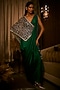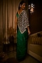 Featuring a midnight moss green draped gown saree in pure satin and net base with an attached tulle cape having pearls and beads hand embroidery. Accentuate it with zircon earrings, soft curls and block heels for cocktail soirees or evening celebrations.