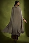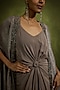Featuring a muted mauve draped dress in pure crepe silk and wrinkled tulle base with a sculpted waist knot. It is paired with a metallic copper cape jacket having beaded tassel hand embroidery. Accentuate it with statement jewellery and heels for an evening wear.