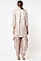 Featuring a nude high-low shirt in cotton crepe base with aari embroidery and foil print. It is paired with a matching pre-draped dhoti.