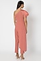 Featuring rose pink straight pants in italian crepe base with crystalline embellishments. It is paired with a matching asymmetric one shoulder top having an organza detailed sleeve.