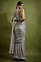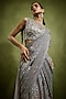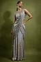 Featuring a silver metallic draped saree in holographic georgette base. It is paired with a high-neck blouse having tonal sequins, beads and pearl embellishments, including beaded fringe sleeves. Accentuate it with statement jewellery and heels for wedding or cocktail ceremonies.