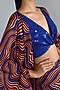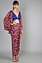 Featuring a sky blue top in organza, georgette, and banana crepe base with thread and sequins embroidery. It is paired with a contrasting multicolored cape and a draped skirt.