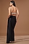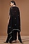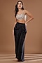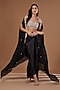 Featuring a black cape in chinon georgette base with thread, sequins and cutdana embroidery. It is paired with a bemberg silk embroidered crop top and crepe skirt. Perfect for a sangeet or cocktail ceremony.