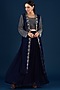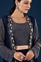 Featuring a blue jacket in chinon georgette base with cutdana embroidery. It is paired with a matching crop top and a skirt.