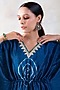 Featuring a blue kaftan in bamber silk base with tie-dye print, drawstrings, beads and sequins embroidery.
