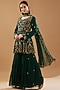 Featuring a bottle green kurta in georgette base with floral, thread, sequins, and dabka embroidery. It is paired with matching sharara pants and a dupatta.