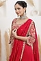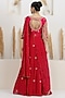 Featuring a cherry red gown saree in georgette base with an attached drape, cutdana, sequins, and pearl embroidery. Accentuate it with emerald jewellery, a polti bag and block heels for an engagement, sangeet, or cocktail ceremonies.