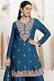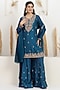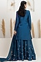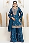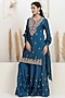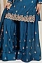 Featuring a cobalt blue kurta in bemberg silk base with sequins, dabka, pearl, beads, zari, gota and resham embroidery. It is paired with sharara pants and an organza dual-shaded dupatta. Accentuate it with polki stud earrings, a polti bag and juttis for a festive occasions, sangeet or cultural celebrations.