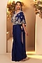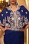 Featuring an english blue pre-stitched saree in chinon georgette base. It is paired with a bustier and a poncho-style cape having floral zari embroidery. Accentuate it with statement earrings and heels for sangeet ceremonies.