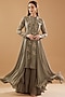 Featuring a grey asymmetric tunic in georgette base with cutdana, dabka and zari embroidery. It is paired with matching palazzo pants.