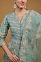 Featuring a greyish blue peplum top in silk and organza silk base with sequins, beads, dabka and zari embroidery. It is paired with crepe palazzo pants and an organza dupatta. Accentuate with statement earrings and heels for a complete look.