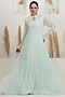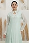 Featuring an ice blue gown in georgette base with cutdana, pearl and sequins embroidery. Accentuate it with zircon jewellery, a clutch bag and heels for a a cocktail, reception or an evening celebrations.