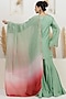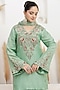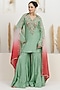 Featuring a mint green kurta in bemberg silk base with sequins, dabka, pearl, beads, zari, gota and resham embroidery. It is paired with sharara pants and an organza dual-shaded dupatta. Accentuate it with polki stud earrings, a polti bag and juttis for a festive occasions, sangeet or cultural celebrations.