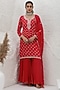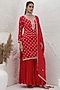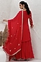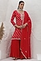 Featuring a scarlet red in chinon georgette base with cutdana, beads, pearl and sequins hand embroidery. It is paired with sharara pants and an organza scalloped dupatta. Accentuate it with zircon earrings, embellished block heels and a potli bag for a festive occasion, sangeet or cultural celebrations.