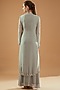 Featuring a water grey jacket in organza base with thread, cutdana, and pearl embroidery. It is paired with a matching chinon georgette gown and an embroidered belt.