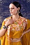Featuring a yellow cape in organza base with mirror, sequins and resham embroidery. It is paired with a matching bamber silk embroidery blouse and palazzo pants.