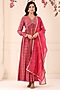 Featuring a magenta gown in muslin base with print and hand embroidery. It is paired with a matching organza dupatta.