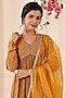Featuring a mustard gown in muslin base with print and hand embroidery. It is paired with a matching organza dupatta.
