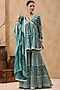 Featuring a turkish green peplum top in mulmul base with print and gota patti details. It is paired with matching sharara pants and a gota dupatta.