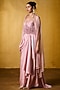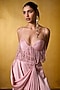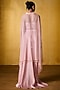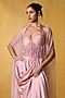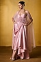 Featuring a pink cape in organza base with embellishment. It is paired with a milano satin corset blouse and a draped skirt. Accentuate the look with block heels and ear cuffs to strike the perfect balance between elegance and edge at cocktail soirees.