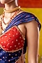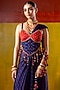 Featuring a blue and red skirt saree in satin organza base. It is paired with a corset and a drape. Accentuate it with polki jewellery and heels for cocktail ceremony or sangeet nights.