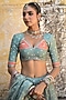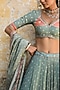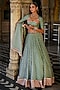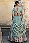 Featuring a green lehenga in chiffon base with bandhej print and striped border. It is paired with a muslin blouse having a sweetheart neckline, gota sleeves and kanchi work, including a chanderi bandhej dupatta and print. Accentuate it with gold or kundan jewellery and embellished heels for a radiant look, perfect for a wedding or festive celebration.