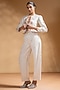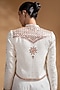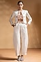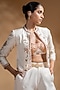 Featuring an off-white jacket in muslin base with gota work. It is paired with a bralette and pants. Accentuate it with statement earrings and strappy heels for a chic look, perfect for evening parties or glamorous gala events.