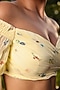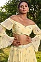 Featuring a pastel yellow tiered lehenga in chiffon base. It is paired with a matching off-shoulder blouse.