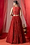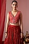 Featuring a red koti in muslin base with a v-neckline and embroidery. It is paired with a chanderi flared skirt. Accentuate it with polki jewellery and heels for festive occasions or sangeet ceremony.