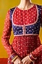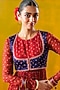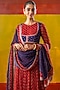 Featuring a red anarkali in chiffon base with bandhani print. It is paired with a blue muslin koti, muslin pants and an organza dupatta. Accentuate it with polki jewellery and block heels for festive occasions or sangeet ceremony.