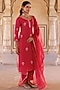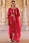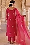Featuring a deep pink kurta in silk base with motif hand embroidery. It is paired with silk pants and an organza zari embroidered dupatta. Accentuate it with dangler earrings and juttis for festive occasions or pooja ceremony.