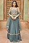 Featuring a grey lehenga in chinon base with embroidery. It is paired with a matching blouse and a net dupatta.