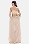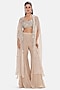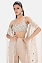 Featuring a beige cape in organza base. It is paired with a blouse having sequins, pearl, brass and beads work, including sharara pants. Accentuate it with dangler earrings and heels for a festive occasion or sangeet ceremony.