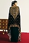 Featuring a black cape in velvet base with mirror and lace embroidery. It is paired with a blouse and a draped skirt. Accentuate it with kundan polki jewellery and block heels for a sangeet, wedding or festive ceremony.
