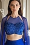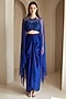 Featuring a blue cape in crushed tissue base with embroidery. It is paired with a bustier and a draped skirt. Accentuate it with zircon jewellery, a clutch and heels for a cocktail soiree, sangeet or engagement ceremony.