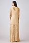 Featuring a gold cape in georgette base with aari work, swarovski and sequins embroidery. It is paired with a bustier and kalidar sharara pants. Accentuate with statement earrings and heels for a festive occasion.