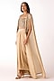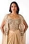 Featuring a golden cape in glass lycra and silk base with sequins, cutdana and stone embroidery. It is paired with an embroidered corset blouse and a draped skirt. Accentuate with diamond jewellery, a clutch bag and metallic heels for a cocktail, sangeet or engagement ceremonies.