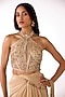 Featuring a golden draped saree in glass lycra and silk base with sequins, cutdana and stone embroidery. It is paired with an embroidered corset blouse. Accentuate with diamond jewellery, a clutch bag and metallic heels for a cocktail, sangeet or engagement ceremonies.