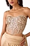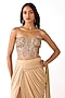 Featuring a golden draped slit saree in glass lycra and silk base with sequins, cutdana and stone embroidery. It is paired with an embroidered corset blouse. Accentuate with diamond jewellery, a clutch bag and metallic heels for a cocktail, sangeet or engagement ceremonies.
