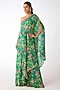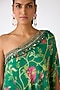 Featuring a green cape in chiffon base with sequins, mirror work and cutdana embroidery. It is paired with a bustier and sharara pants. Accentuate it with statement kundan jewellery and heels for a festive occasion, cocktail party or mehendi ceremony.