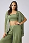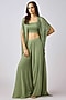 Featuring a green cape in georgette base with cutdana and bead embroidery. It is paired with a bustier and sharara pants. Accentuate with statement earrings and heels for a festive occasion or sangeet ceremony.
