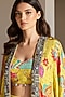 Featuring a lime cape in crepe base with embroidery and print. It is paired with a bustier and a skirt. Accentuate it with zircon jewellery, a clutch and heels for a cocktail soiree, sangeet or engagement ceremony.