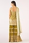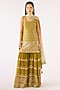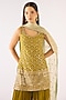 Featuring a lime green kurta in georgette base with sequins and zari embroidery. It is paired with sharara pants and a dupatta. Style it with statement earrings and juttis for a festive family gathering, mehendi or daytime celebration.