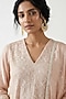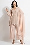 Featuring a peach kurta in cotton chanderi base with embroidery. It is paired with a palazzo and a dupatta. Style it with antique gold or kundan jewellery, soft waves, and nude heels for an earthy vibe. Perfect for daytime weddings, festive brunches, and intimate celebrations.