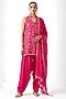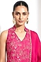 Featuring a pink kurta in chanderi and organza base with zari embroidery. It is paired with a farshi salwar and a dupatta. Style it with antique gold or kundan jewellery, soft waves, and nude heels for an earthy vibe. Perfect for daytime weddings, festive brunches, and intimate celebrations.