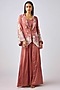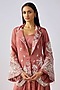 Featuring a pink cape in georgette base with aari work, swarovski and sequins embroidery. It is paired with a bustier and sharara pants. Accentuate with statement earrings and heels for a festive occasion.