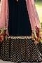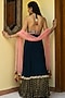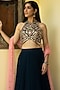 Featuring a teal blue flared lehenga in chinon base with pleats. It is paired with a matching raw silk blouse having mirror, nakshi, and resham thread embroidery, and a net ruffled dupatta.