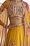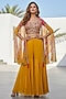 Featuring a yellow cape in georgette base with sequins and lace embroidery. It is paired with sharara pants and a dupatta. Accentuate it with zircon dangler earrings, a clutch and block heels for festive occasion, sangeet or haldi ceremony.